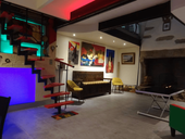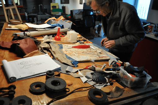 C'est dans son atelier de Pont l'Abbe que l'artiste crée ses tableaux. L'atelier fleure bon le cuir. Les palettes de couleur sont un régal pour l'oeil. La finesse et la souplesse des cuirs un plaisir du toucher. Il y expose aussi régulièrement ses dernières réalisations.